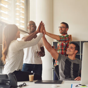 Happy workers putting hands together for a win