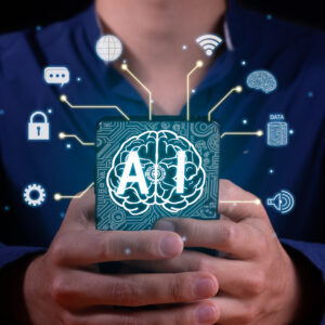 Vertical Photo of A man who uses artificial intelligence inside a cell phone to manage his networks, databases and passwords.