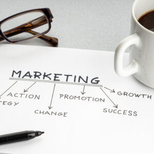 Strategy Marketing concept. Paper sheet with quality ideas or plan, cup of coffee and eyeglasses on desk