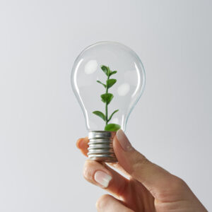 cropped view of woman holding light bulb with green plant on white background